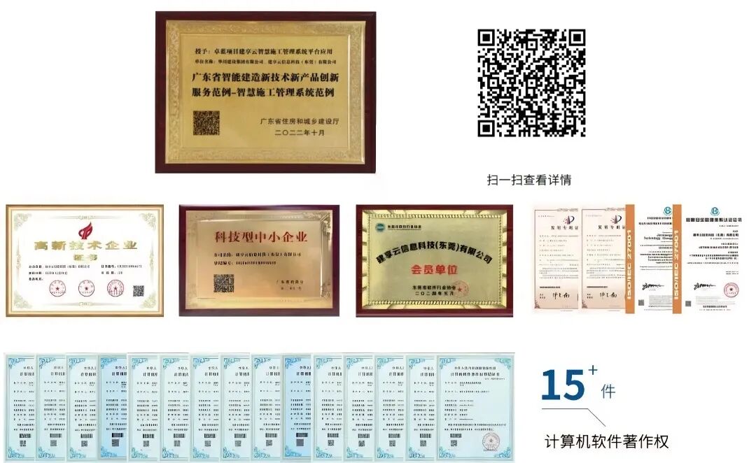 • 权威认证支持:入选省住建厅第一批创新范例目录,使用建享云系统的工程项目,优先支持省市评优评奖。