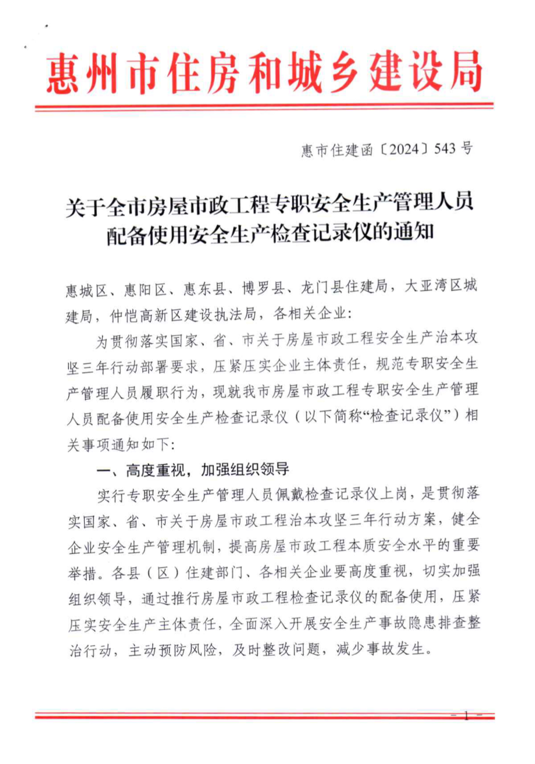 东莞、广州、深圳、惠州四市住建局密集发文(东建质〔2024〕号、穗建质〔2024〕696号、深建规〔2024〕号、惠市住建函〔2024〕543号),明确要求全市房屋市政工程的专职安全员必须强制佩戴安全生产检查记录仪! 核心政策要点如下: