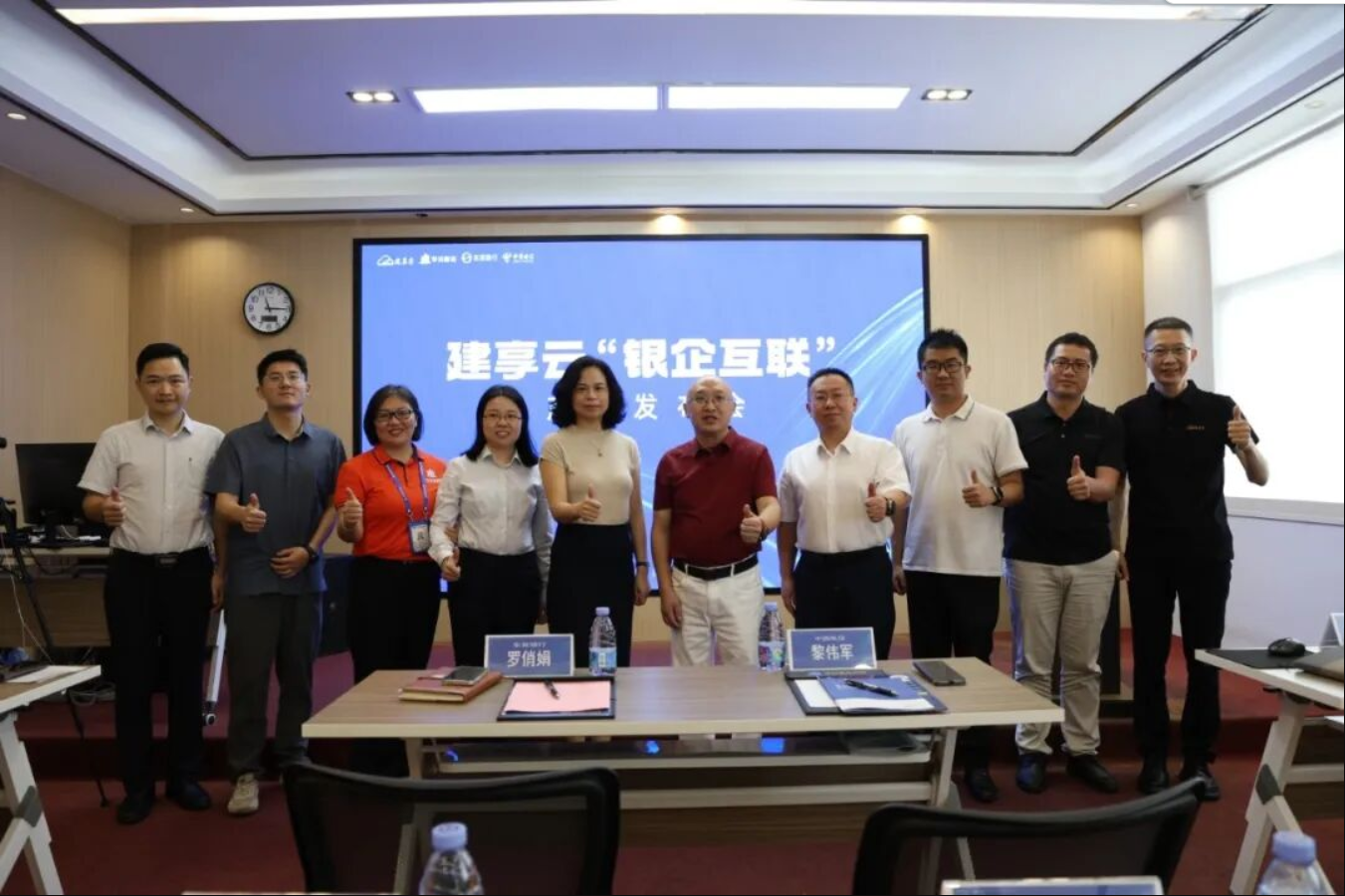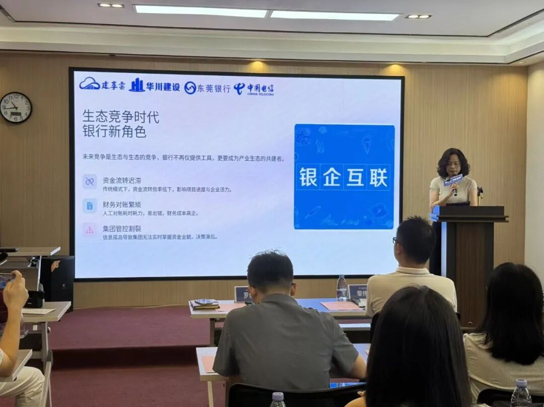 2025年9月26日上午,建享云联合东莞银行、中国电信、华川建设集团在东莞市望牛墩举办“银企互联”产品发布会。建享云诚挚欢迎各位合作伙伴与嘉宾的到来!东莞银行望牛墩支行行长罗俏娟、东莞银行总行高级产品经理张毅莹、东莞银行客户经理曾涛、中国电信东莞水乡分公司副总经理张磊磊、东莞电信水乡分公司云技术总监刘安、望牛墩电信分局CEO黎伟军、中国电信陈旗辉、合作客户代表等共计30多人参加本次发布会,共同见证建筑行业财资管理数字化转型的重要时刻。