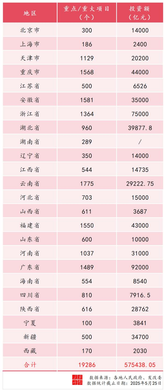 据建筑时报大数据统计,截至2025年5月,全国24个省市已发布2025年重点工程项目计划,总投资额高达57.5万亿元,年度计划投资超9.5万亿元。各地纷纷亮出重磅项目清单,彰显基建攻坚决心: