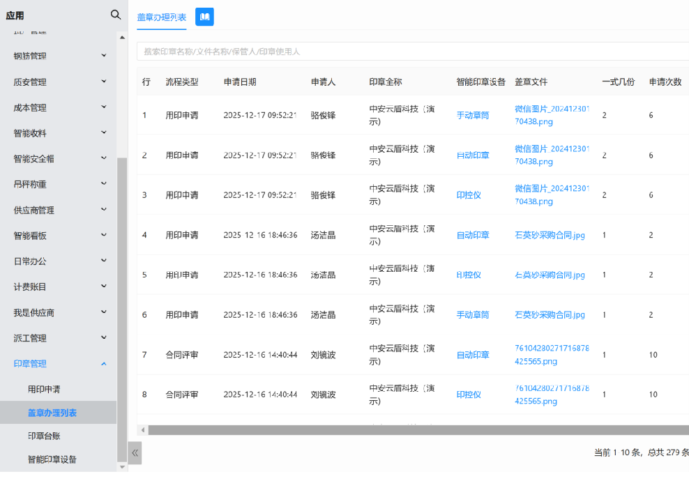 区别于传统双重审批流模式,系统采用单一审批流设计,智能印章与建享云工程管理系统数据互通、流程协同,同步完成文件审核与用印审核,无需重复发起申请,也无需跨系统切换,大幅降低操作成本。同时兼容光敏章、铜章、翻转章等主流印章形态,既满足大型企业多分支机构、多项目的集中管控需求,也适配中小型项目的轻量化使用场景,随企业业务发展可灵活拓展功能。
