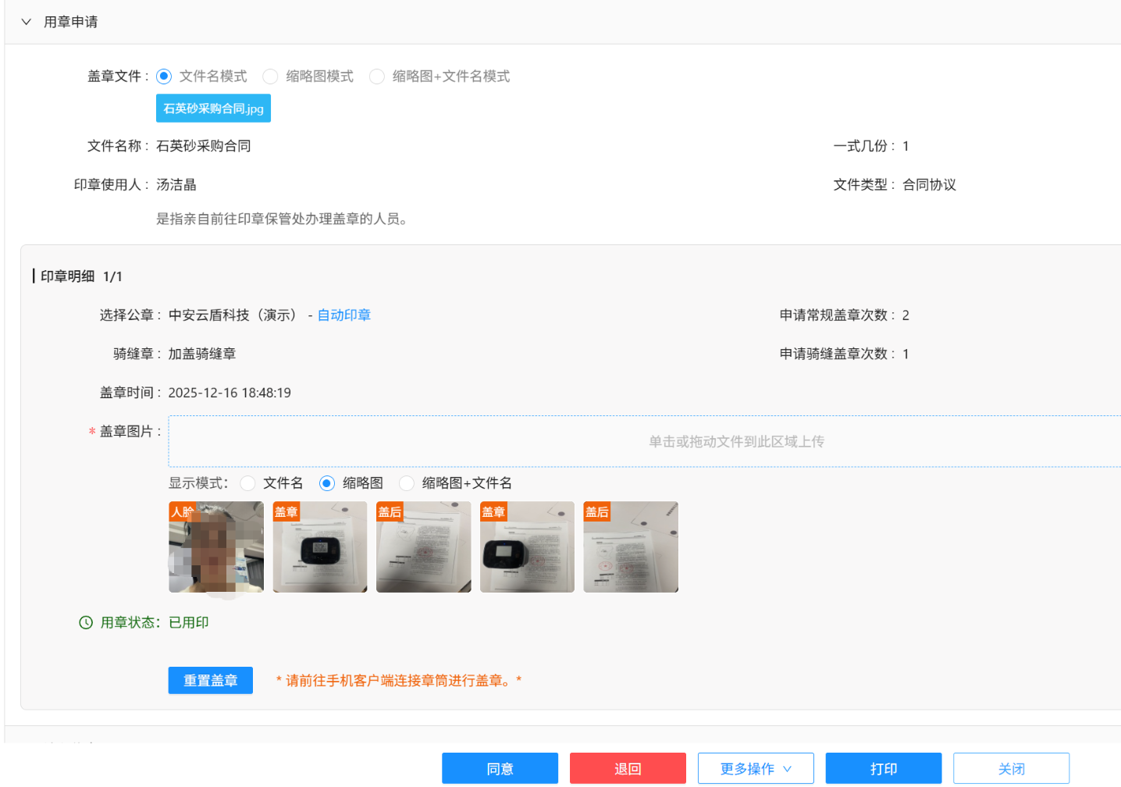 创新采用 “一盖一码” 技术与全程留痕机制,确保每一次用印都有据可查。盖章前需扫描智能章桶动态二维码,与系统流程数据匹配校验通过后方可操作;系统实时记录盖章人、时间、地点、次数及全过程文件影像,数据自动沉淀形成电子化台账不可篡改,实现用印文件与申请文件可视化比对,为合规审计、责任追溯提供铁证,有效降低印管员职务风险。