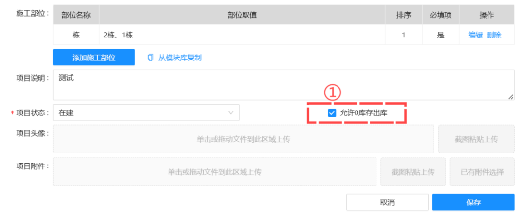1、【项目中心-编辑项目】新增“允许0库存出库”的功能