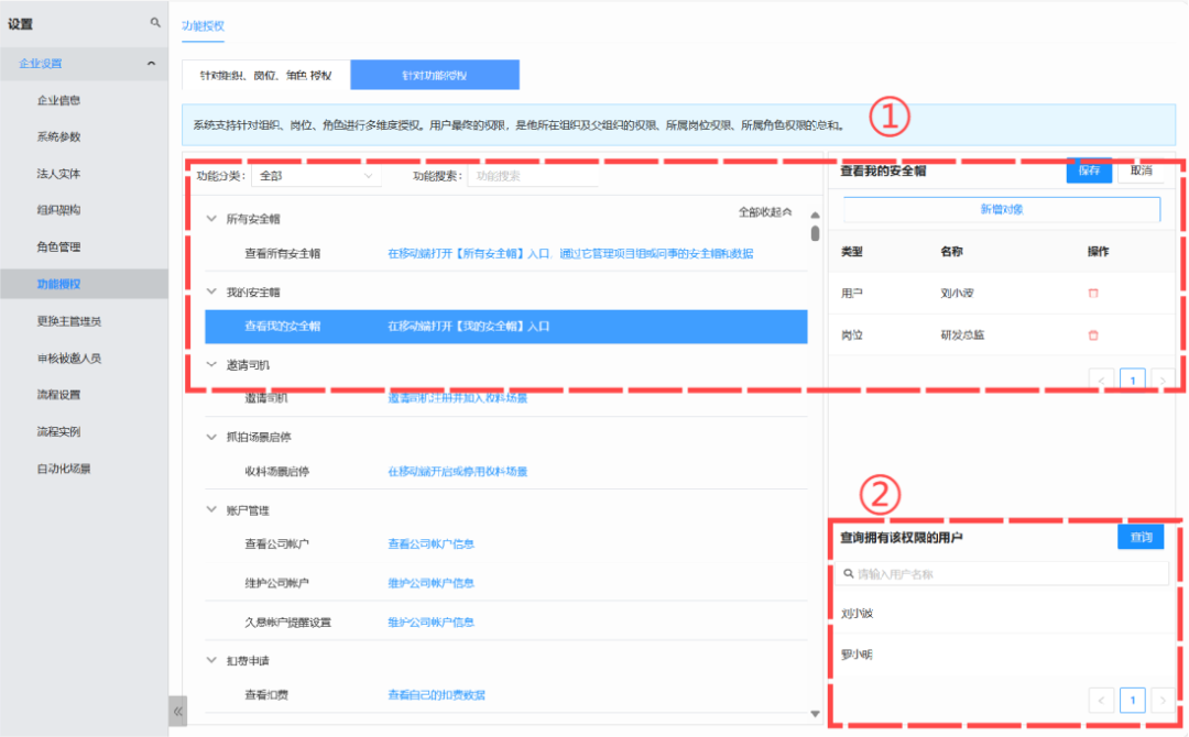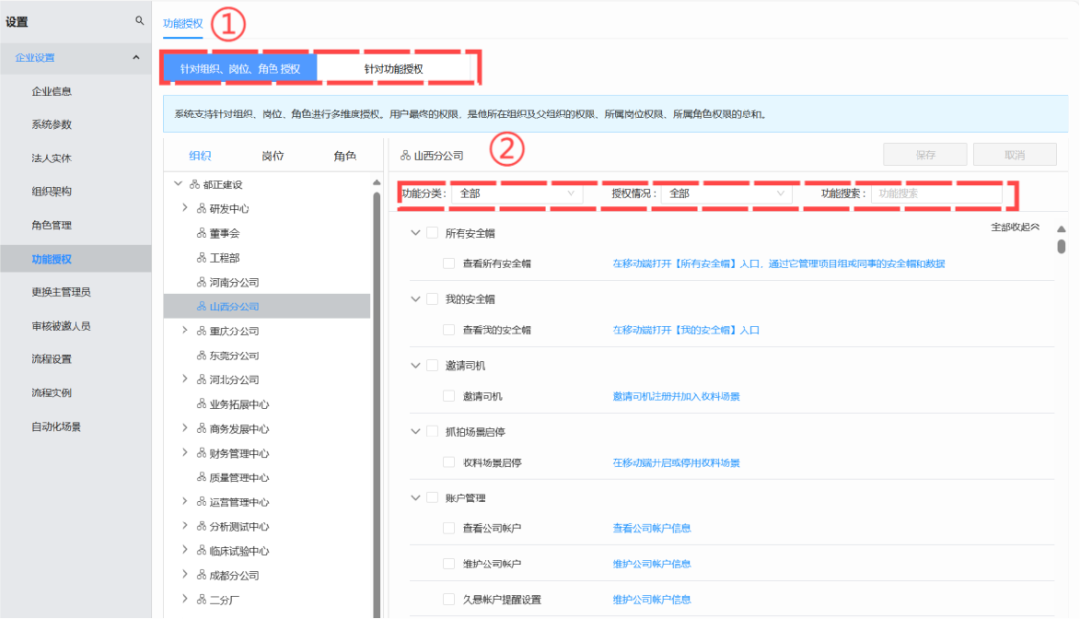 1、【设置-功能授权】拆分为“针对组织、岗位、角色授权”及“针对功能授权”的设置