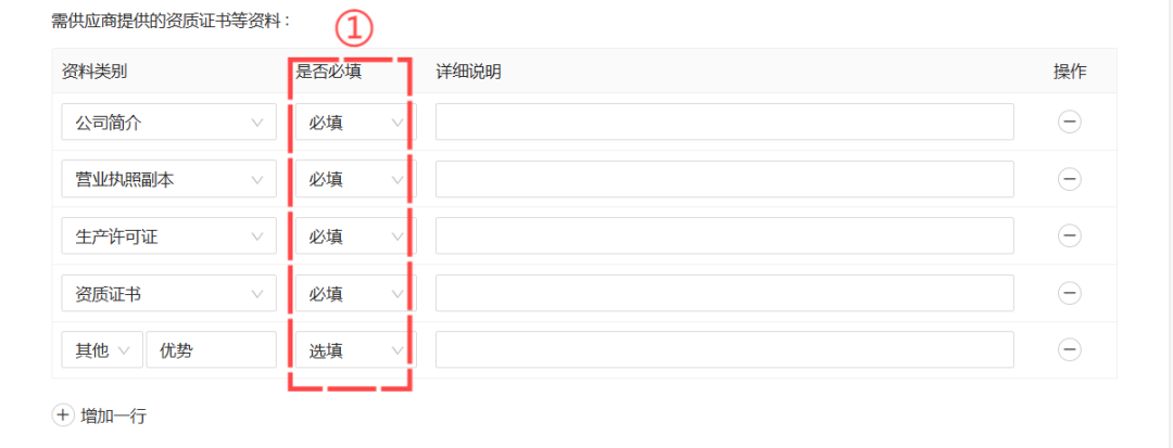 1、入库资格审核邀请,提供资料增加“是否必填”的自定义控制