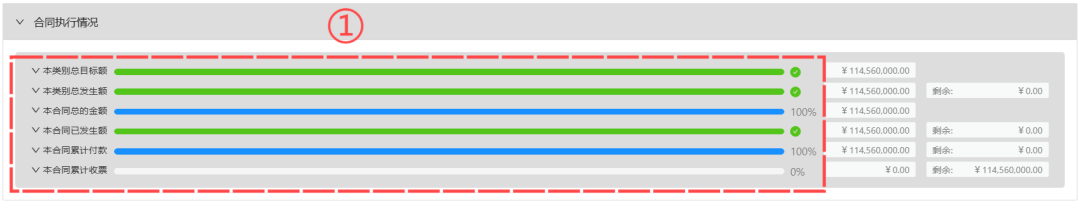 3、【项目整体运行状况】和【合同执行情况】中,对明细进行了权限控制,即展开收款、付款等明细时如果无对应的【查看所有】权限,则不能查看,界面会有相应的无权限提示