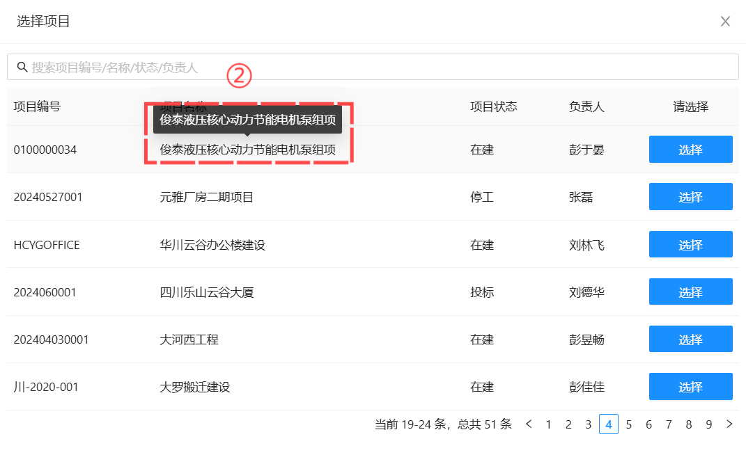 2、项目和合同选择窗体,鼠标指向编号及名称时提示完整信息