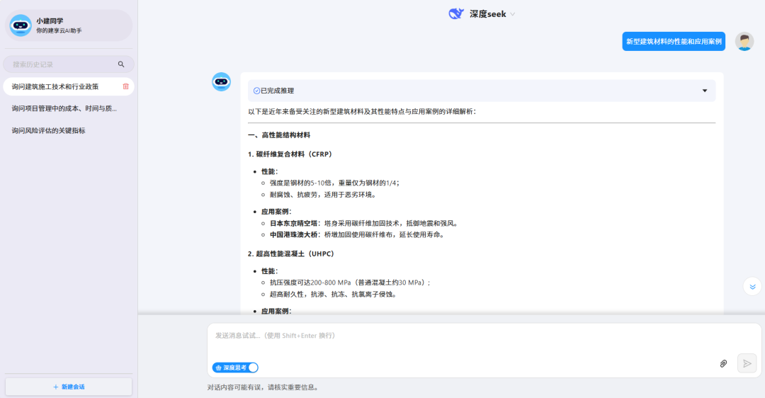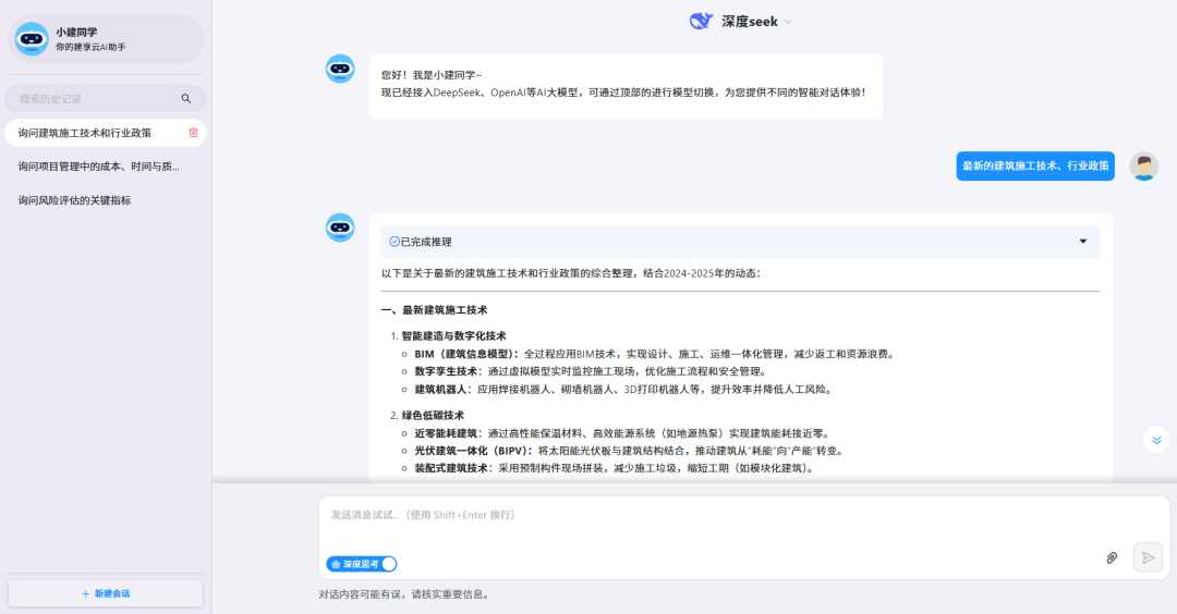 「小建同学」的核心能力十分强大,原先已集成了OpenAI GPT3.5.并采用了同源技术,与chatGPT保持一致。「小建同学」新升级后,接入了先进的DeepSeek大模型,更是突破了传统AI的线性对话模式,拥有复杂逻辑推理、上下文连贯交互和主动服务预测等深度思考能力。无论是复杂的项目管理问题,还是紧急的现场状况,小建同学都能迅速分析并提供最优解决方案,助力管理人员和工程师做出更加明智的决策。