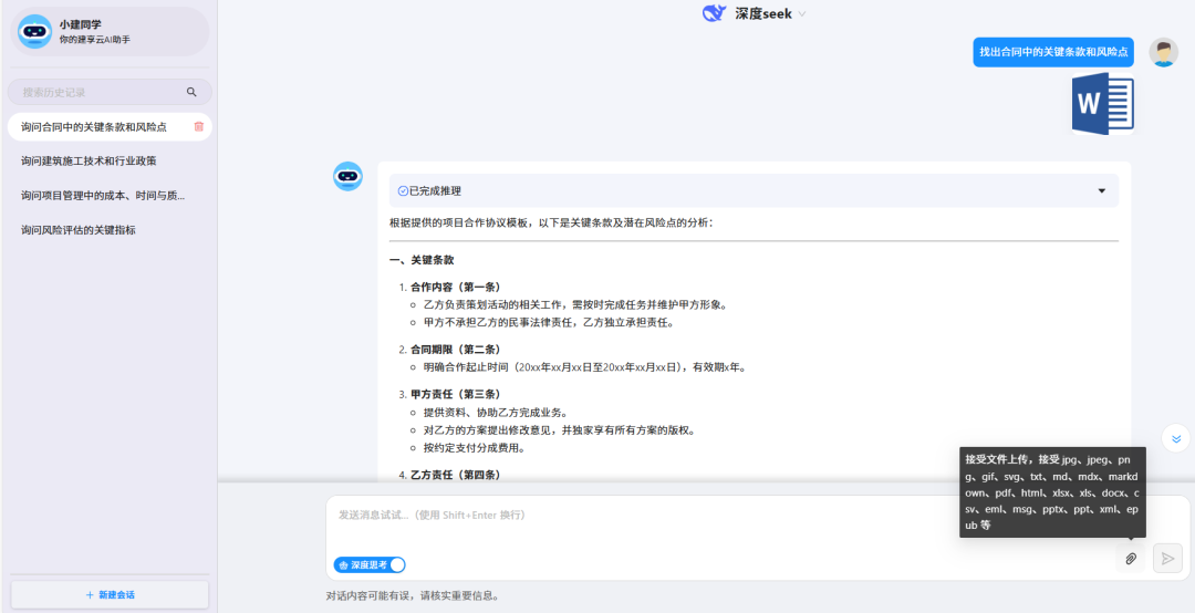 在建筑施工过程中,管理人员和工程师需要处理大量的文件和图片。「小建同学」的文件/图片理解功能,能够对这些信息进行全面解析。用户可以将项目相关的文件上传给「小建同学」,包括Word文档、Excel表格、PDF文件等,它都能够快速解析文件内容,并提取关键信息。例如,在审核项目合同文件时,「小建同学」可以快速找出合同中的关键条款和风险点,帮助用户更好地理解和管理合同。