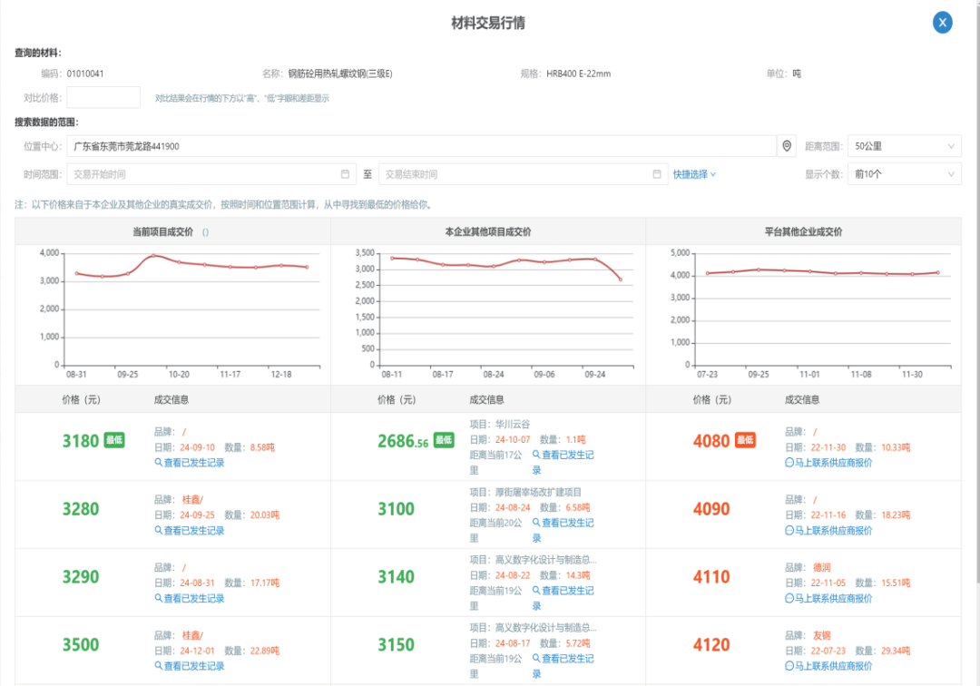 数据共享:通过材料行情模块可按时间和空间维度,查询指定材料的历史购买价格、同行购买价格作为采购决策依据,帮您找到材料最低价。