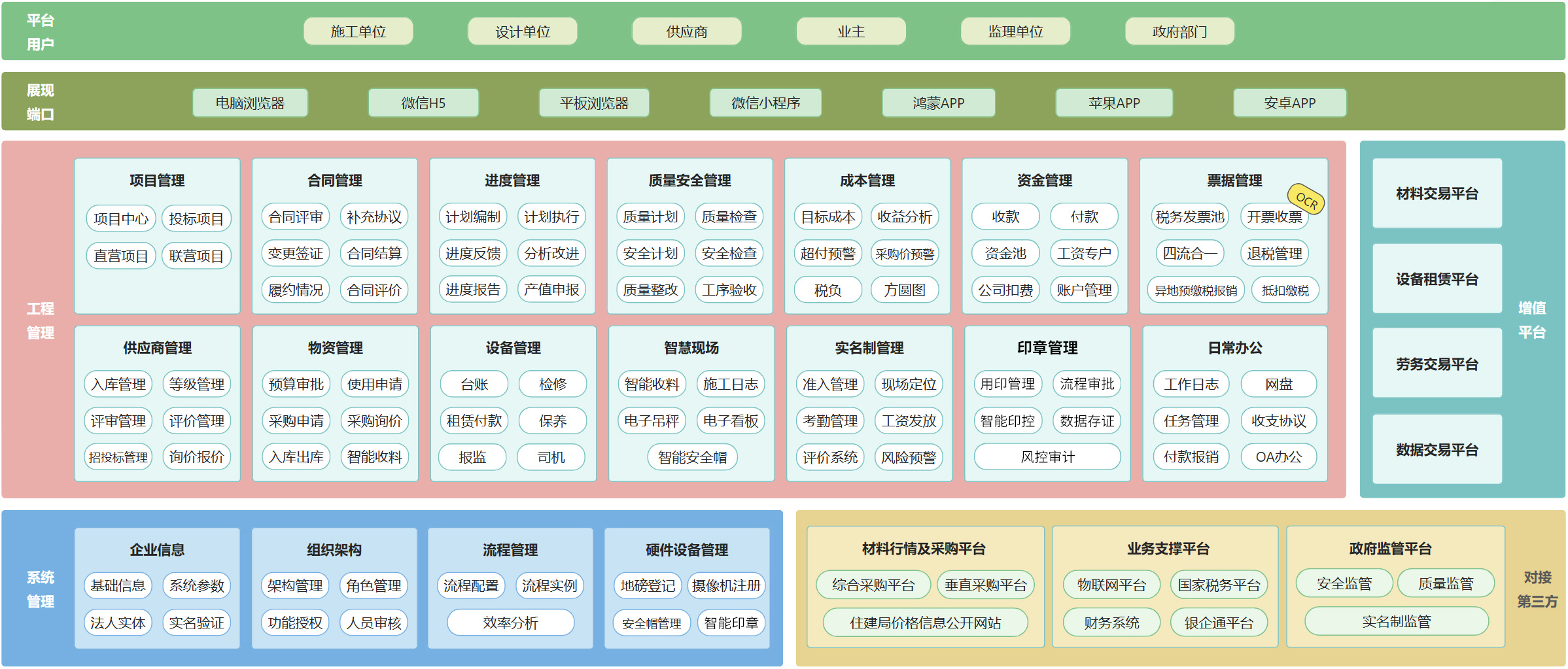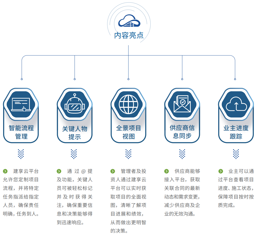 “十四五”规划鼓励建筑企业优化内部管理,提升运营效率。建享云以项目为中心,打造了全景项目视图、供应商信息同步、业主进度跟踪等智能化功能,并打破了部门间的信息壁垒,促进企业内部及与外部合作伙伴的高效协作。同时,系统支持定制化流程和任务分配,明确责任分工,提高工作效率,为企业构建标准化、数字化的管理体系,增强市场竞争力。