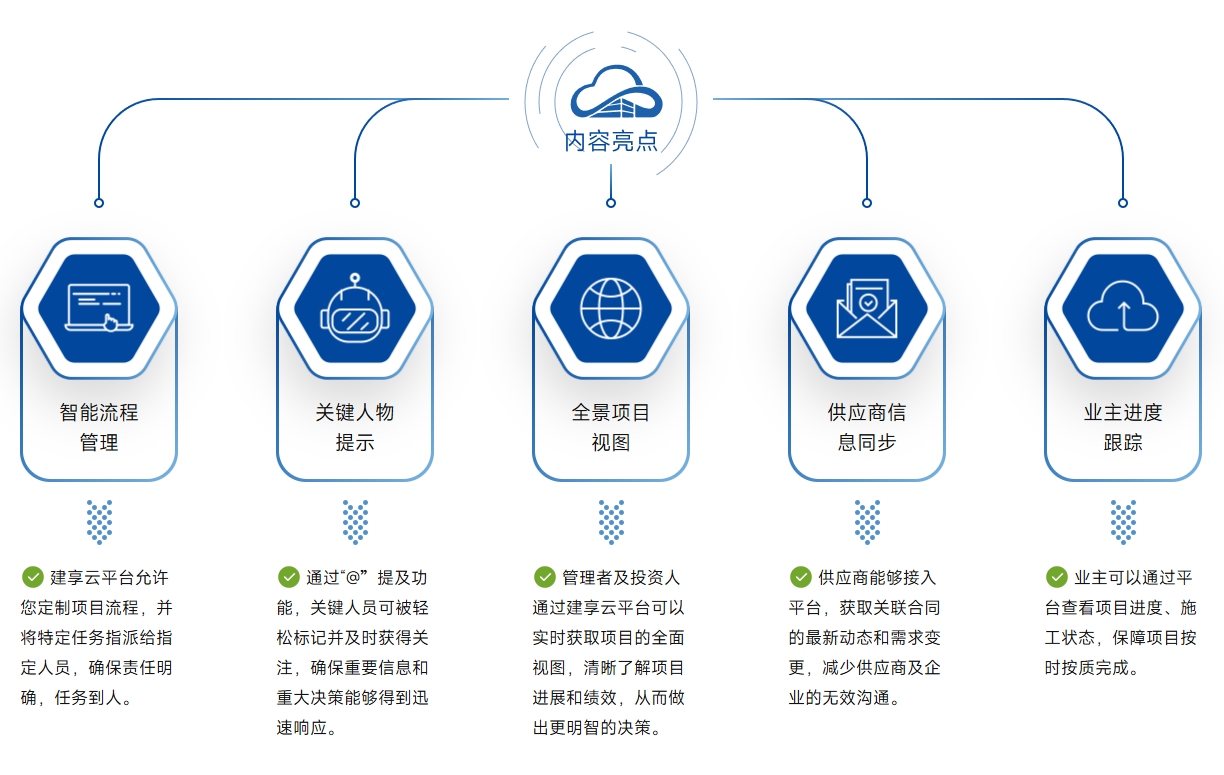 · 高效协同:打破部门壁垒,实现跨部门、跨岗位信息互通,人员、进度、成本、质量、风险一屏掌控,为科学决策提供支撑。