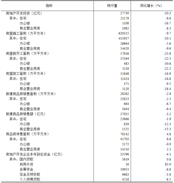 施工面积、新开工面积、竣工面积等关键指标均呈现下滑趋势,房屋施工面积 620315 万平方米,同比下降 9.7%;房屋新开工面积 17836 万平方米,下降 23.8%;房屋竣工面积 15648 万平方米,下降 16.9%。