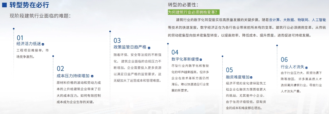 这些行业失血的创口,是建筑企业集体面临的生存拷问。而传统的管理模式,已经难以适应如今的市场环境,建筑行业迫切需要借助数字化手段实现转型升级。
