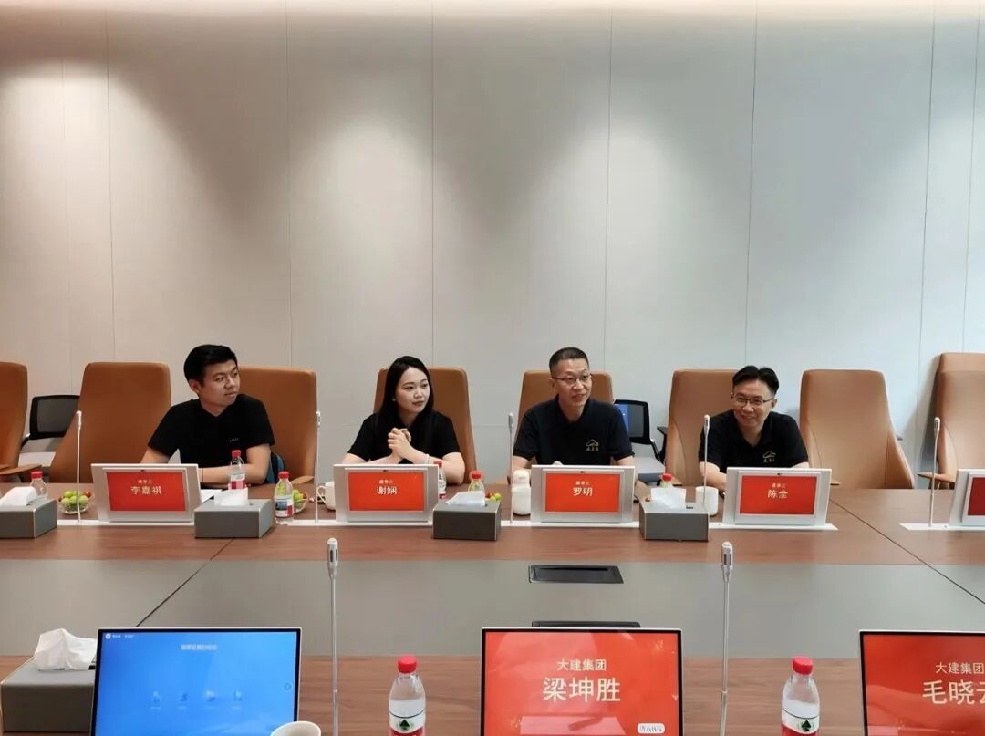 双方参会人员齐聚一堂,共同见证这一历史性的瞬间。大建集团由总经理梁坤胜、副总经理陈志成、副总经理毛晓云、财务总监郭爱粉、信息化主管周志森等领导出席签约现场;建享云则由总经理罗明、总设计师陈全、商务经理谢娴、BI工程师李嘉祺代表出席。