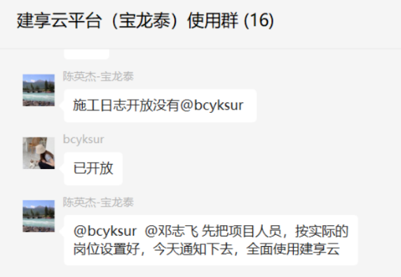 会后,宝龙泰陈总迅速在服务群里下达指示项目部“全面使用建享云平台的施工日志模块”: